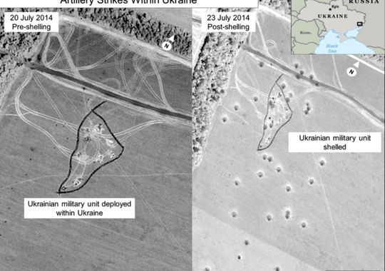 美国国务院提供的卫星图片显示,大炮和火箭在俄罗斯境内发射,落地之后乌克兰境内出现弹坑。