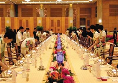 晚宴餐桌中央铺有一条长达34米、印有骆驼图案的黄沙色云锦桌旗。据新华视点