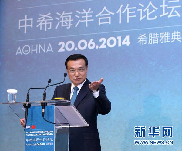 6月20日,国务院总理李克强在雅典与希腊总理萨马拉斯共同出席中希海洋合作论坛并发表演讲。新华社记者 庞兴雷 摄