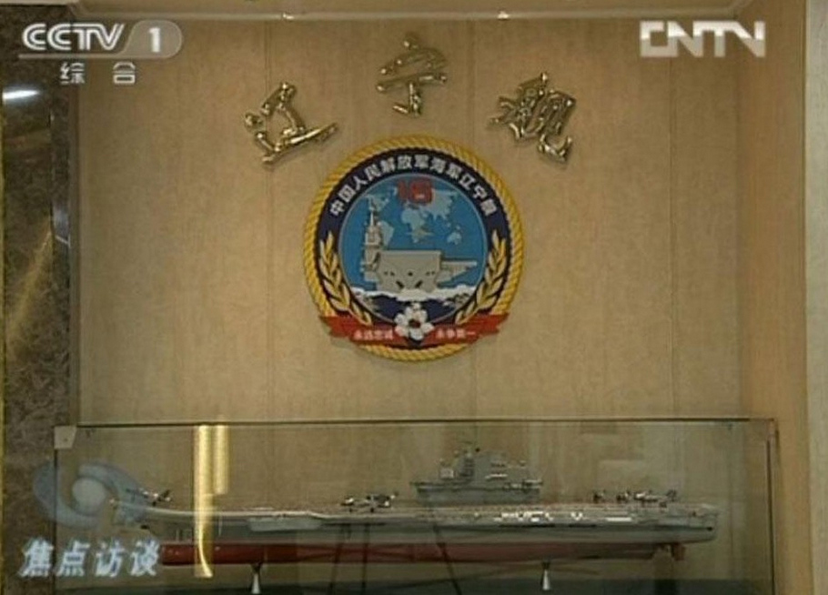 “辽宁舰”舰名与模型。(央视截图)