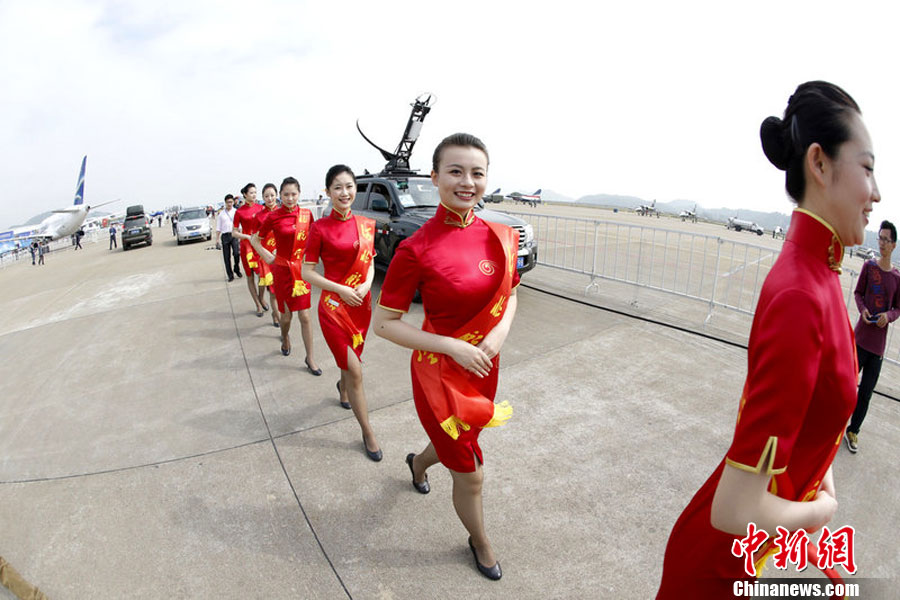 2012年11月12日,2012珠海航展开幕前夕,礼仪小姐身着旗袍亮相机场,尽显曲线美。图片来源:东方IC 版权作品 请勿转载