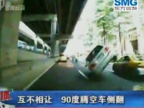 实拍:两车互不相让 90度腾空车侧翻