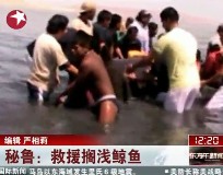 秘鲁鲸鱼搁浅 众人齐心协力成功援救