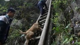 孩子爬“天梯”上学 狗狗也爬