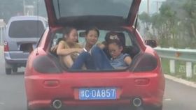跑车后备箱装3女孩马路狂奔