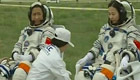 工作人员向三名航天员献上鲜花和哈达
