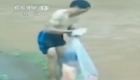 实拍越南男子用塑料袋运孩子过河上学