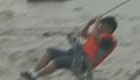 实拍男子被困湍急河流 借助绳索艰难靠岸
