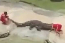泰国驯兽员上演“鳄口脱险”