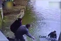 婴儿车滑入池塘 小伙急救
