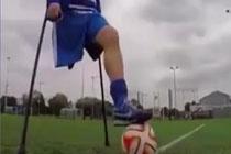 单腿小伙拄双拐 踢足球动作熟练