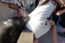 小女孩被海狮咬裙子拖下水