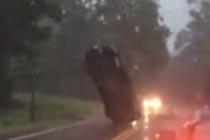 实拍美国一汽车头朝下直立在马路间
