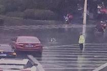 交警冒雨执勤 路过司机从车窗抛出一把伞