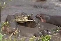实拍鳄鱼遭河马家族群殴