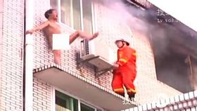 裸体男子火场欲跳楼 消防劝说施救