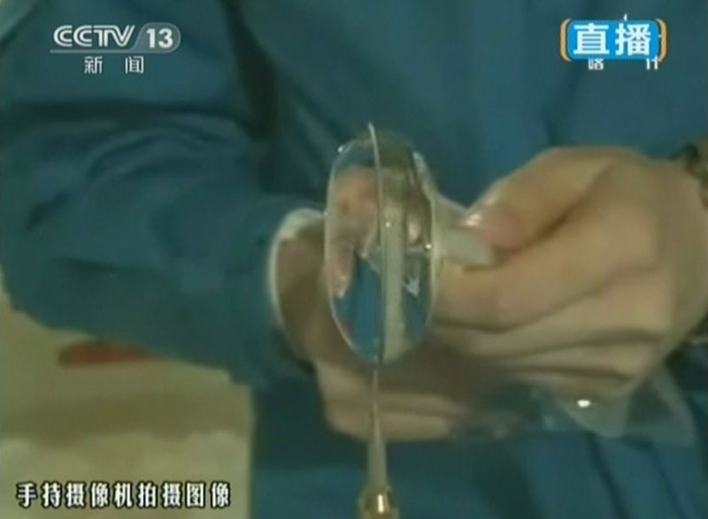 6月20日上午10时许,神舟十号航天员进行中国首次太空授课,女航天员王亚平担任主讲,成为中国首位“太空教师”。图为王亚平进行“水膜”演示。(视频截图)