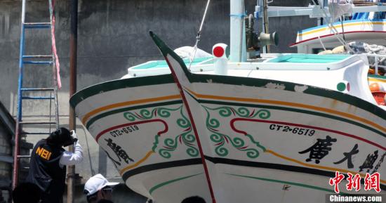 资料图:5月29日,菲律宾调查小组由台湾检方陪同,对停靠在屏东东港一造船厂内的“广大兴28号”进行勘验鉴识。图为菲律宾国家调查局(NBI)人员对船身弹孔拍照取证。中新社发 刘舒凌 摄