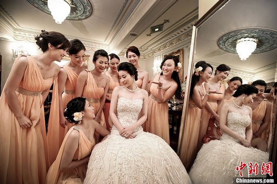 11月8日,郭晶晶出嫁前的喜悦。当天,霍启刚和郭晶晶正式的婚礼仪式在香港沙宣道霍家大宅举行。超过百位嘉宾,包括夫妻双方的家庭成员,伴娘和伴郎,出席并见证了婚姻的仪式。中新社发 通联 摄